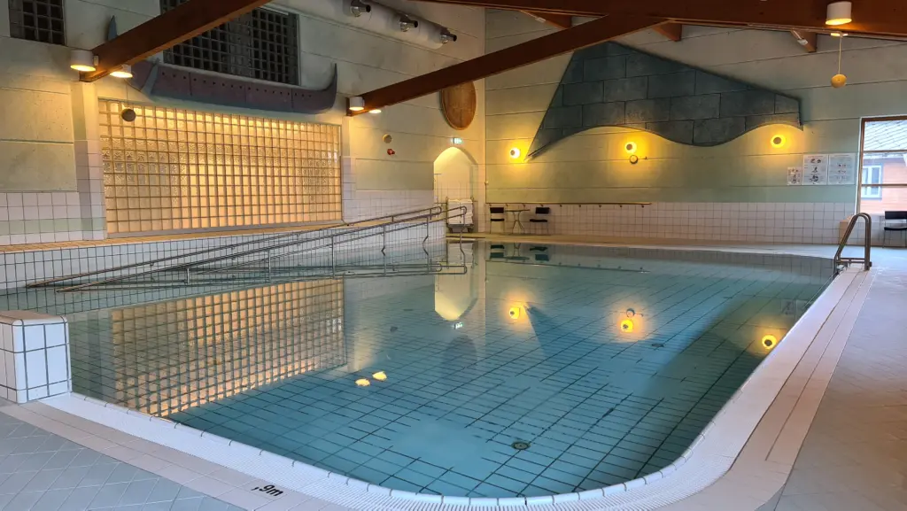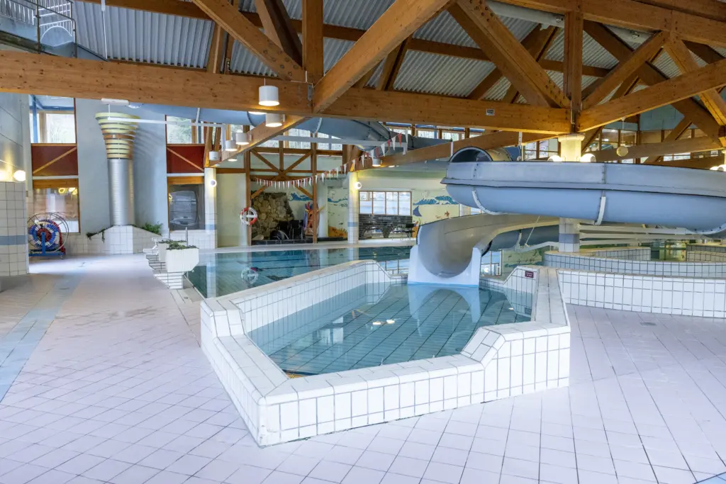 Vi har stort badeanlegg med to basseng, vannsklie og badstover. Det er tilkomst for rullestolbrukarar til begge bassenga.