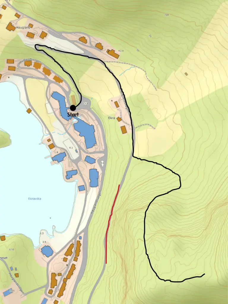 Følg Hauglandsvegen opp frå senteret 200 meter i første kryss. Følg vegen vidare ca 200 meter, og ta til venstre inn i skogen på merka sti. Det er lett terreng i starten som går over i bratt og til dels vanskeleg terreng. (Raud merking på kartet er et rasutsett området.)