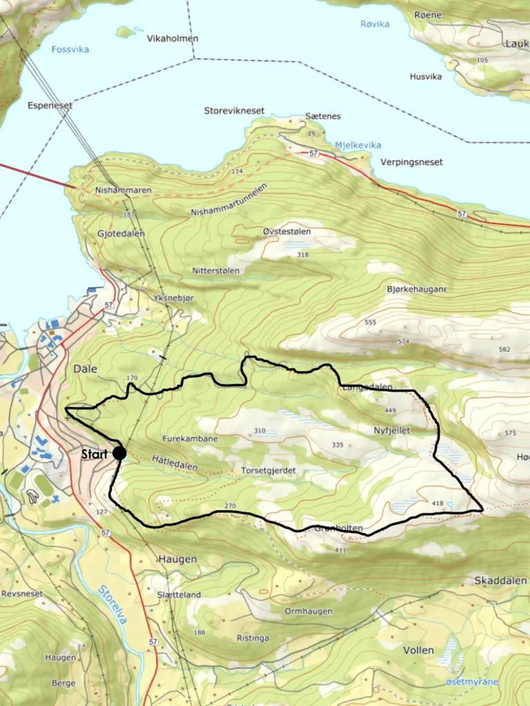 Turen startar ved «Demma» i Dale, som ligg 10 minuttars biltur frå Haugland. Frå Demma går ein på skogsveg til Torset, deretter vidare på sti til Grøneholten, som ligg ca. 400moh. Jamn stigning heile vegen.