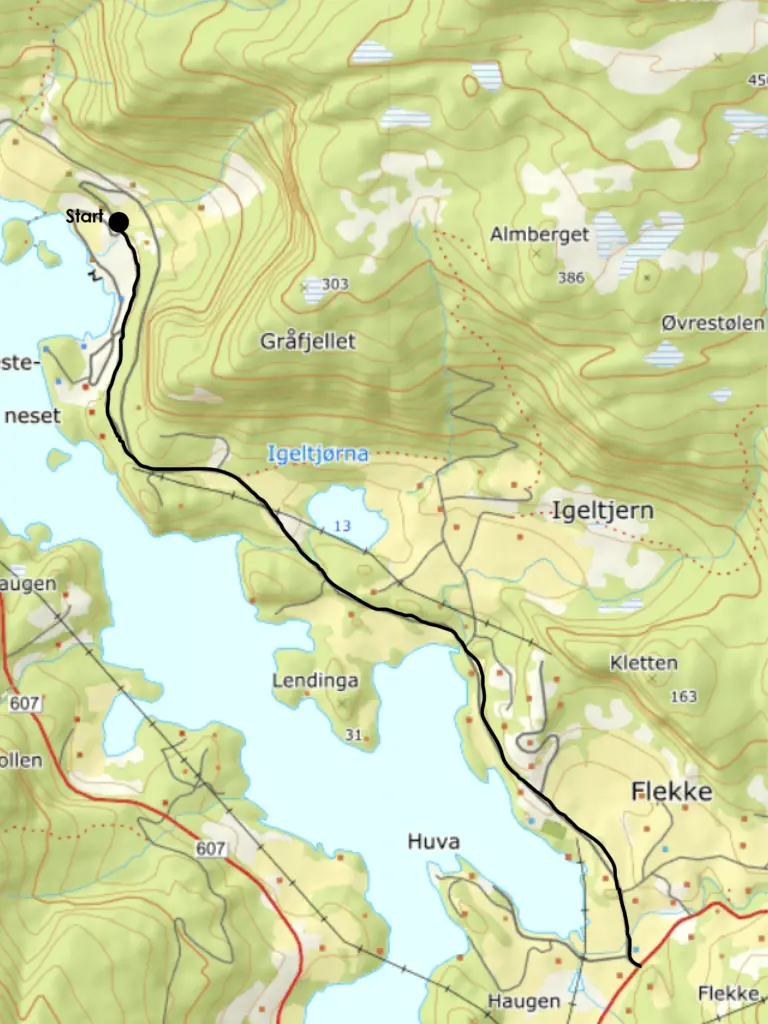 Denne ruta består i hovudsak av asfaltert veg, og den er godt eigna for sykkelturar. Frå Hauglandssenteret går/syklar du vidare i retning Flekke. I Flekke er det fleire plassar der det er naturleg å ta seg ein pause om ein treng det. Ved Joker Flekke er det benkar, samt at det ligg eit grindbygg like i nærleiken med bord og benkar. Her er det fint å slappe av i fred og ro. Turen går så vidare tilbake til Hauglandssenteret, same veg som ein kom.