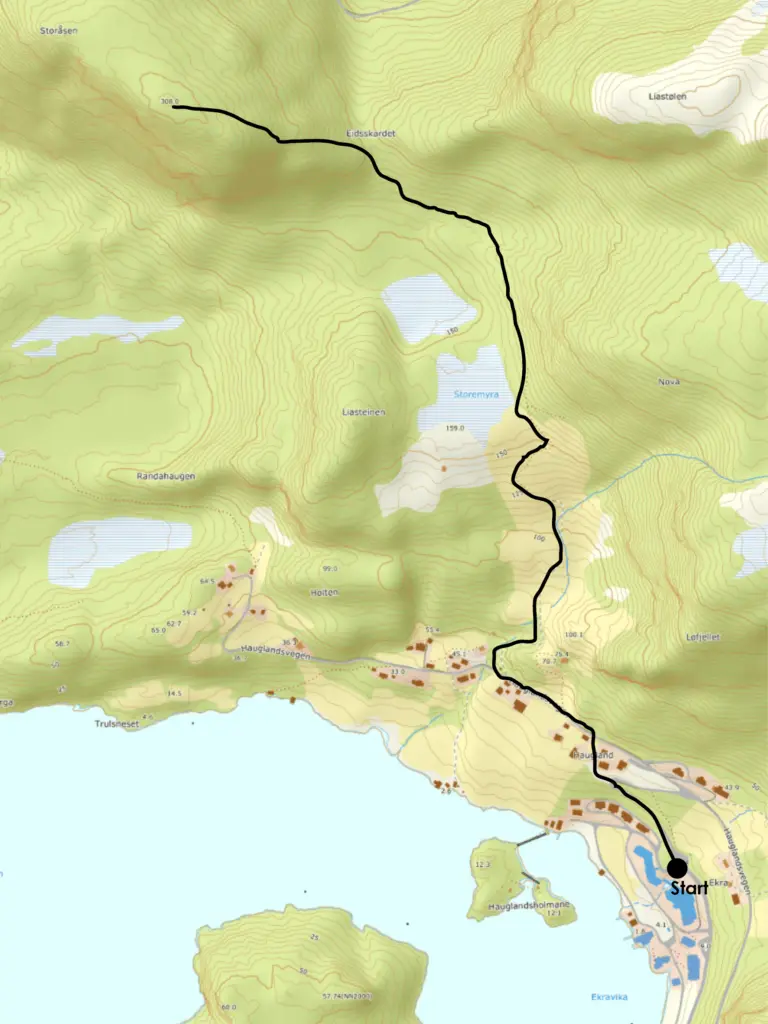 Det er bratt og jamn stigning på grus-/grasveg til Storemyra (ca. 600m), der stien deler seg og du skal gå rett fram mot Dale. Stien flatar ut dei neste 500m. før det igjen er bratt stigning. I Eidsskaret (200moh) deler stien seg, du skal fylgje stien til venstre i bratt terreng og open skog mot Storåsen.