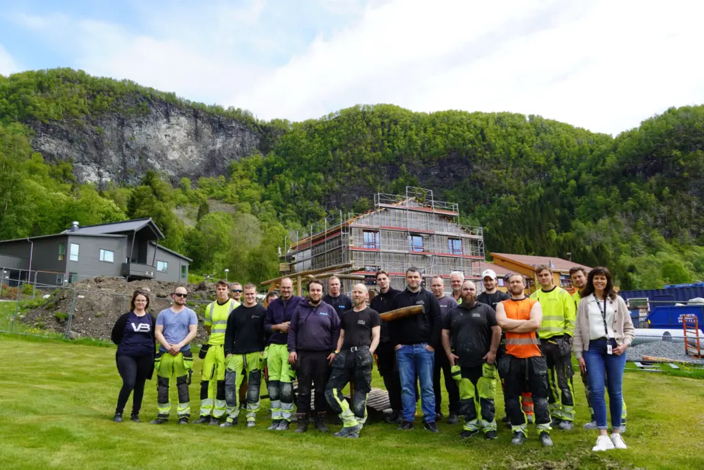 Driftsleiar Elin Håland har leia arbeidet med den nye pasientfløyen. Samarbeidet med totalentreprenør Vestbygg AS og underentreprenørane har vore godt. Her er arbeidslaget samla til kranselag i sommar.